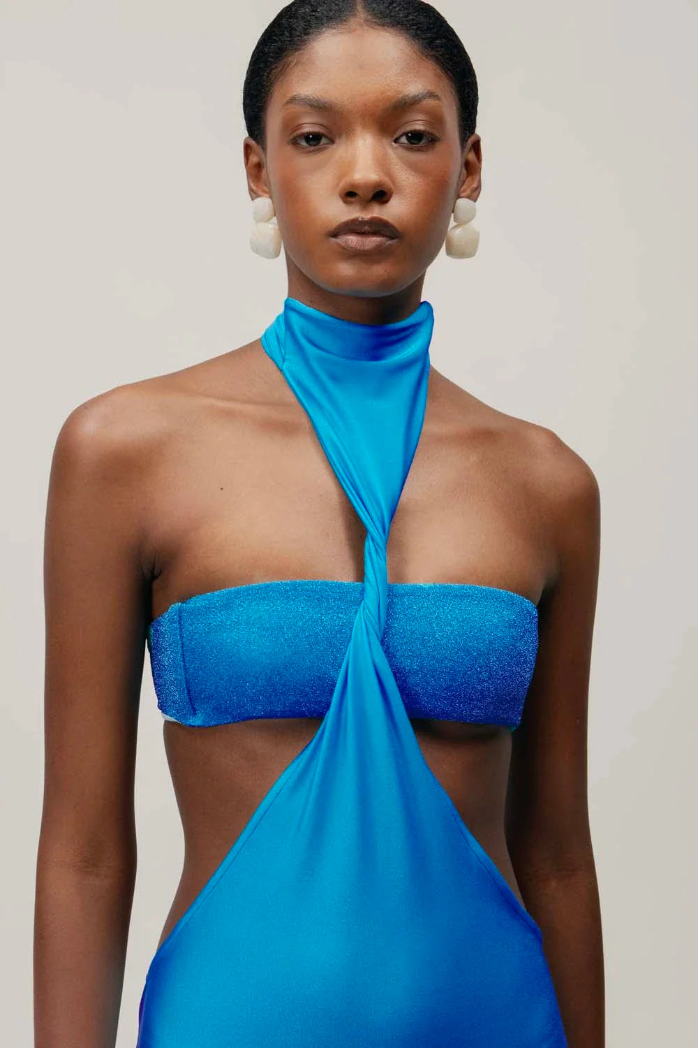 Introducing theÊ"Aluna Dress" in AltiÐ A luxurious blend of style and sustainability. This captivating set features a high-neck dress that ties in the back and a strapless glossy top that create the perfect look. Discover the essence of resort wear with this beach-ready ensemble that combines a conscious sustainable design and beachwear attire in perfect harmony.