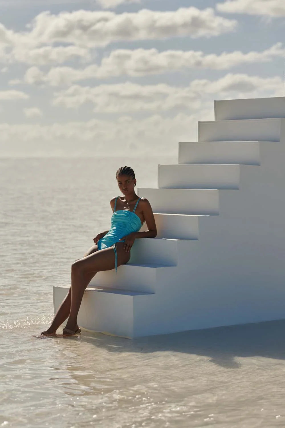 Introducing the "Ancla One Piece" in Celeste – A classic one-piece swimsuit designed with ruched details, an adjustable strap with a glossy fabric for a look that combines timeless charm with modern allure. The adjustable strap offers versatility, allowing you to customize your style with ease. Crafted with meticulous attention to detail and sustainable practices, this swimsuit is a perfect choice for those who seek both style and fashion consciousness.