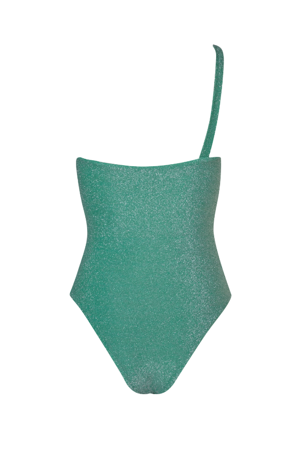 Introducing the "Asaka One-Piece" in Nori – An attention-grabbing ensemble. This figure-hugging one piece, crafted from glossy fabric, features a single shoulder design with a small front cut-out for subtle allure. The standout detail is the Baobab-shaped embellishment at the front, adding a modern and unique touch to this piece.