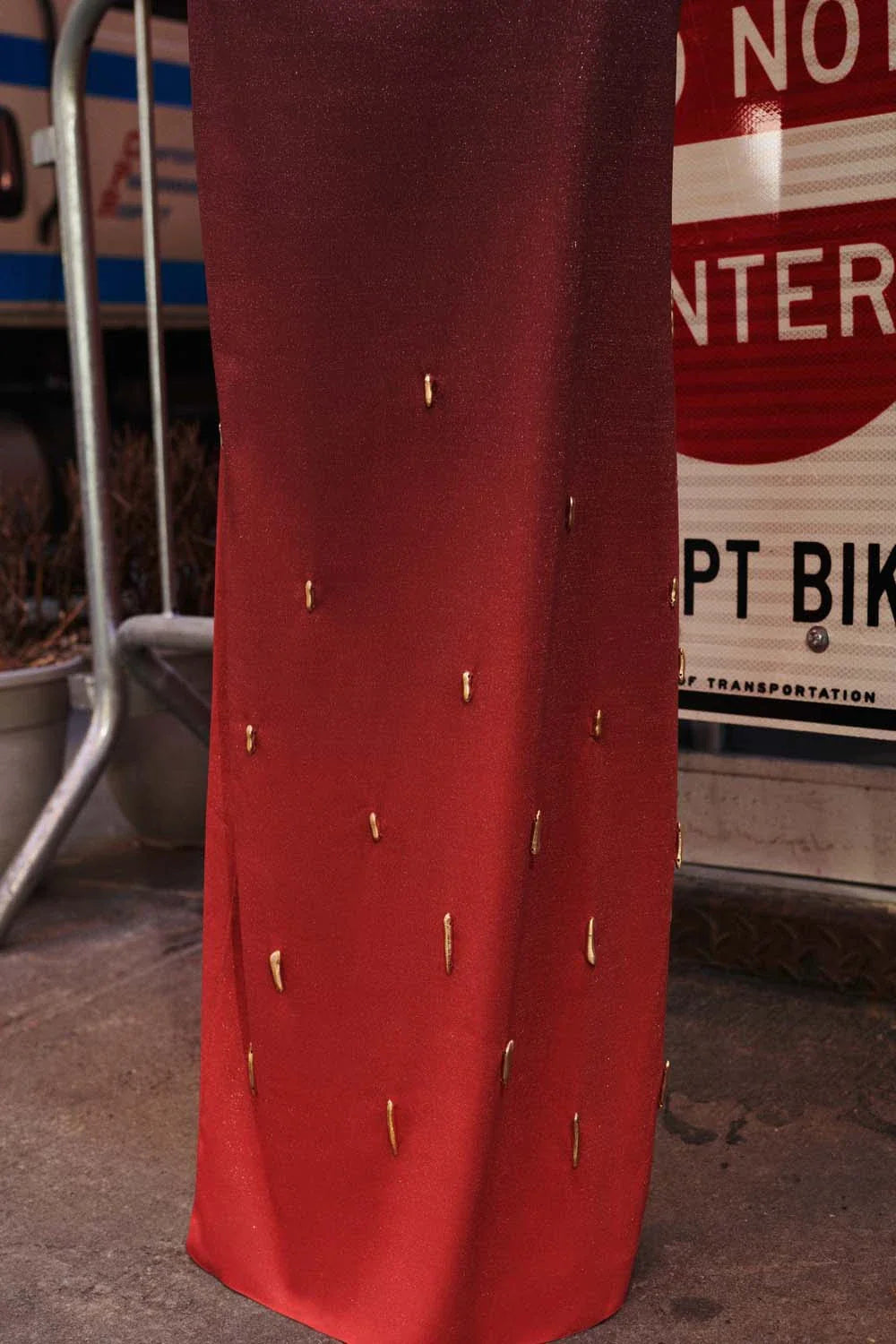 Introducing the "Athena Dress" in Strawberry Sorbet – meticulously crafted, this strapless maxi dress features an exquisite collar detail that wraps around the front of your neck, adding a sophisticated touch. The side slit and slight A-line silhouette enhance its unique style, making it a remarkable statement piece. The skirt is adorned with embroidered Baobab beads, adding a touch of unique elegance. Experience high-end fashion with this dress, designed to radiate contemporary allure.