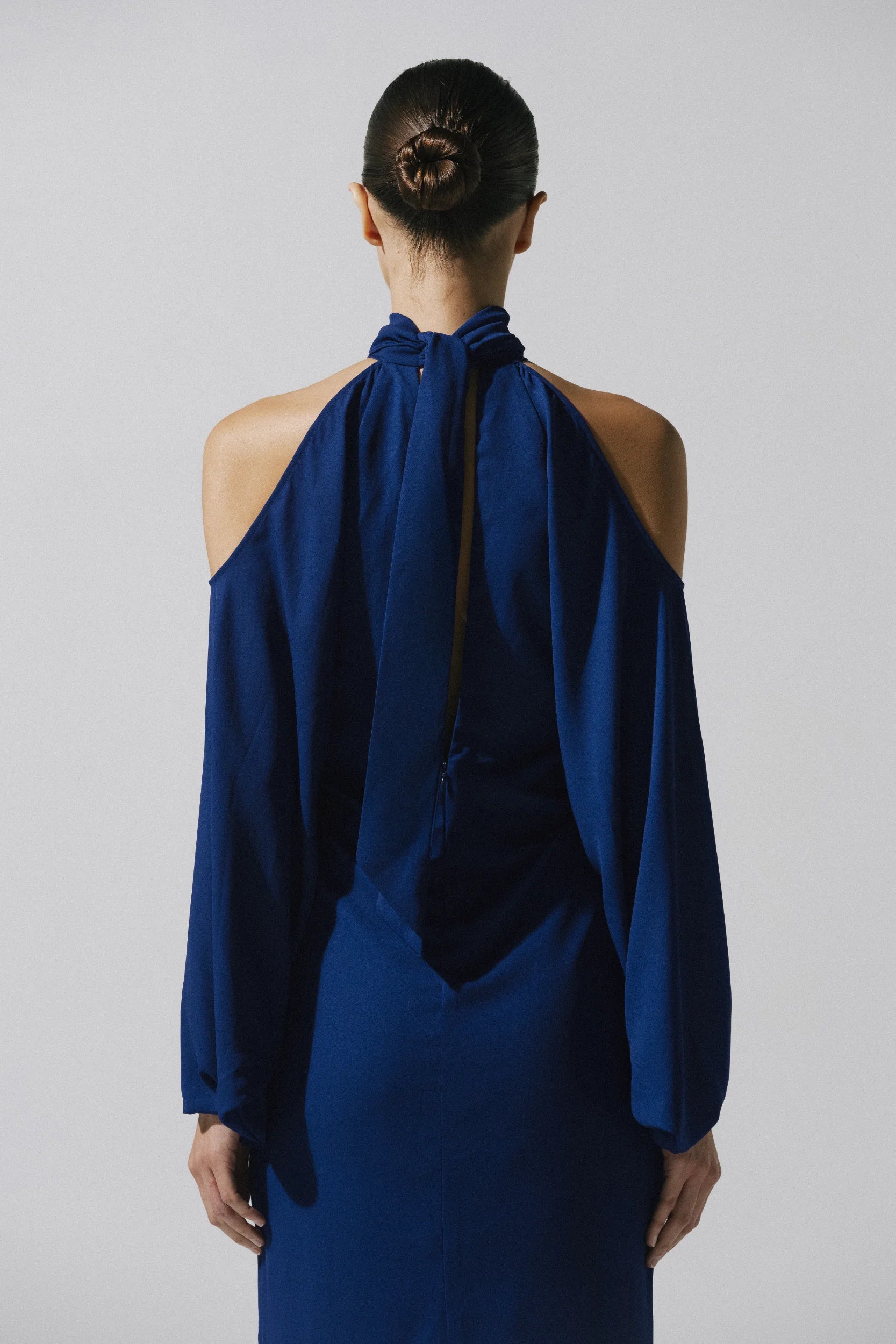Introducing the "Biscay Maxi Dress" in Royal Blue – a halter silhouette with cold-shoulder detailing and a back slit for movement. Finished with a back zipper closure and fully lined for a sleek fit.