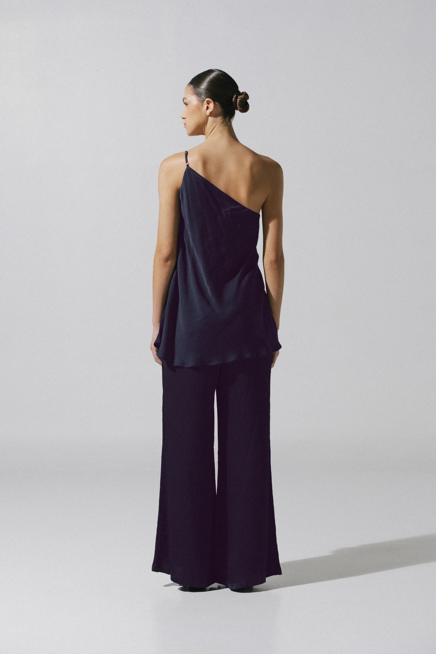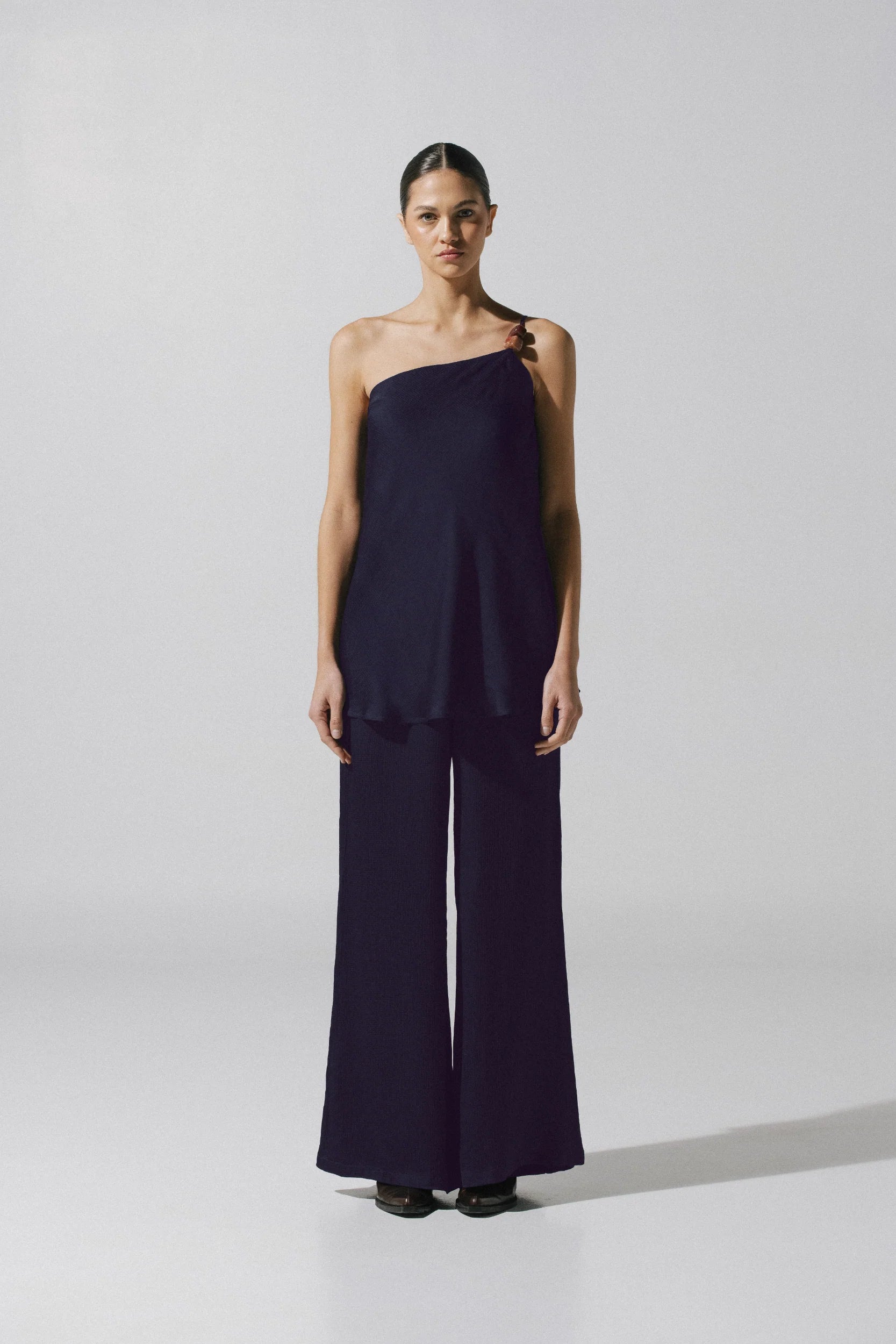 Introducing the "Ferrat Pants" in Night Blue – wide-leg pants crafted from textured fabric with back darts for structure. Designed with a reinforced waistband and finished with a side zipper closure. Unlined for a fluid finish. Pair it with the matching top for a coordinated look.