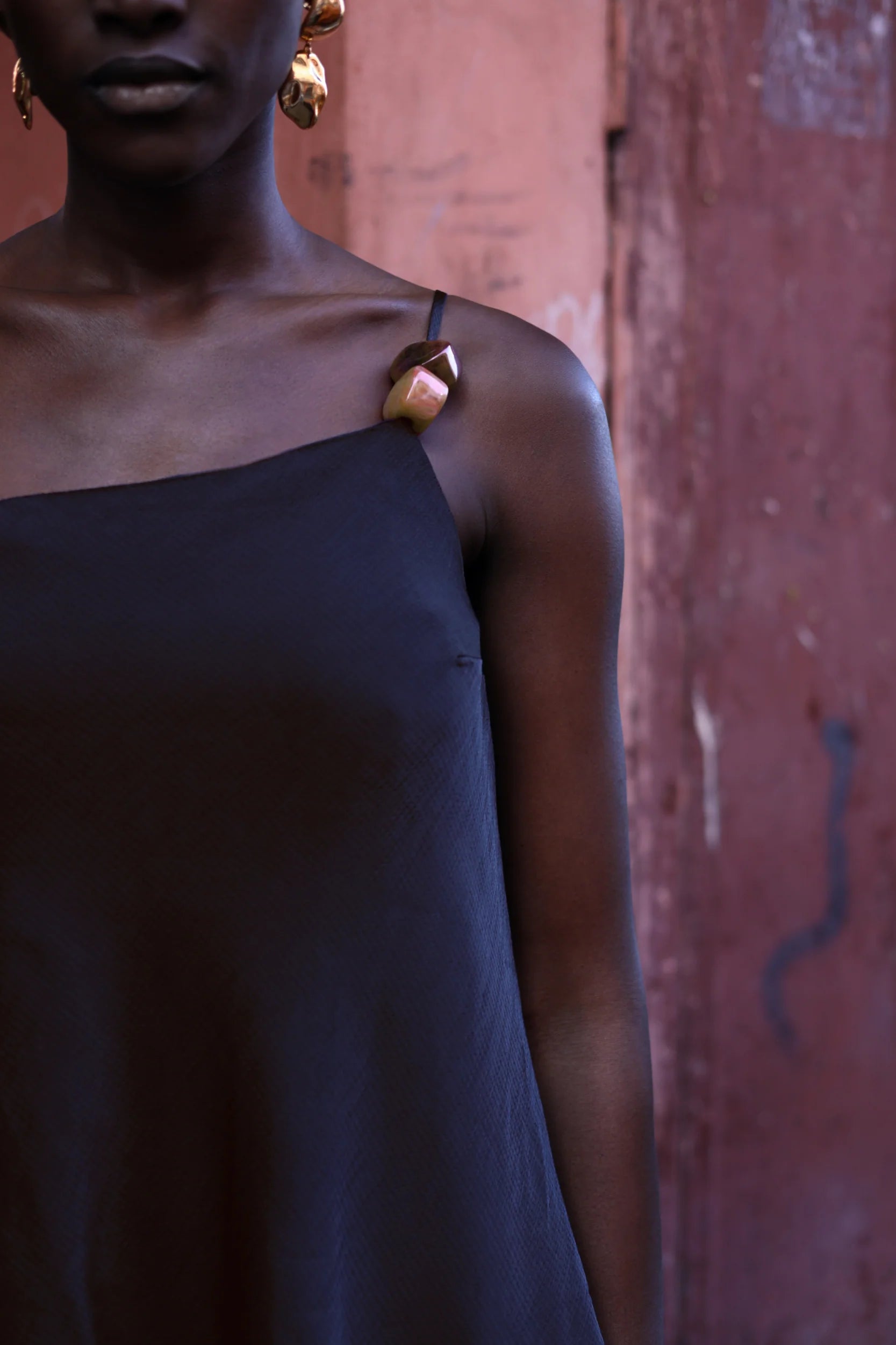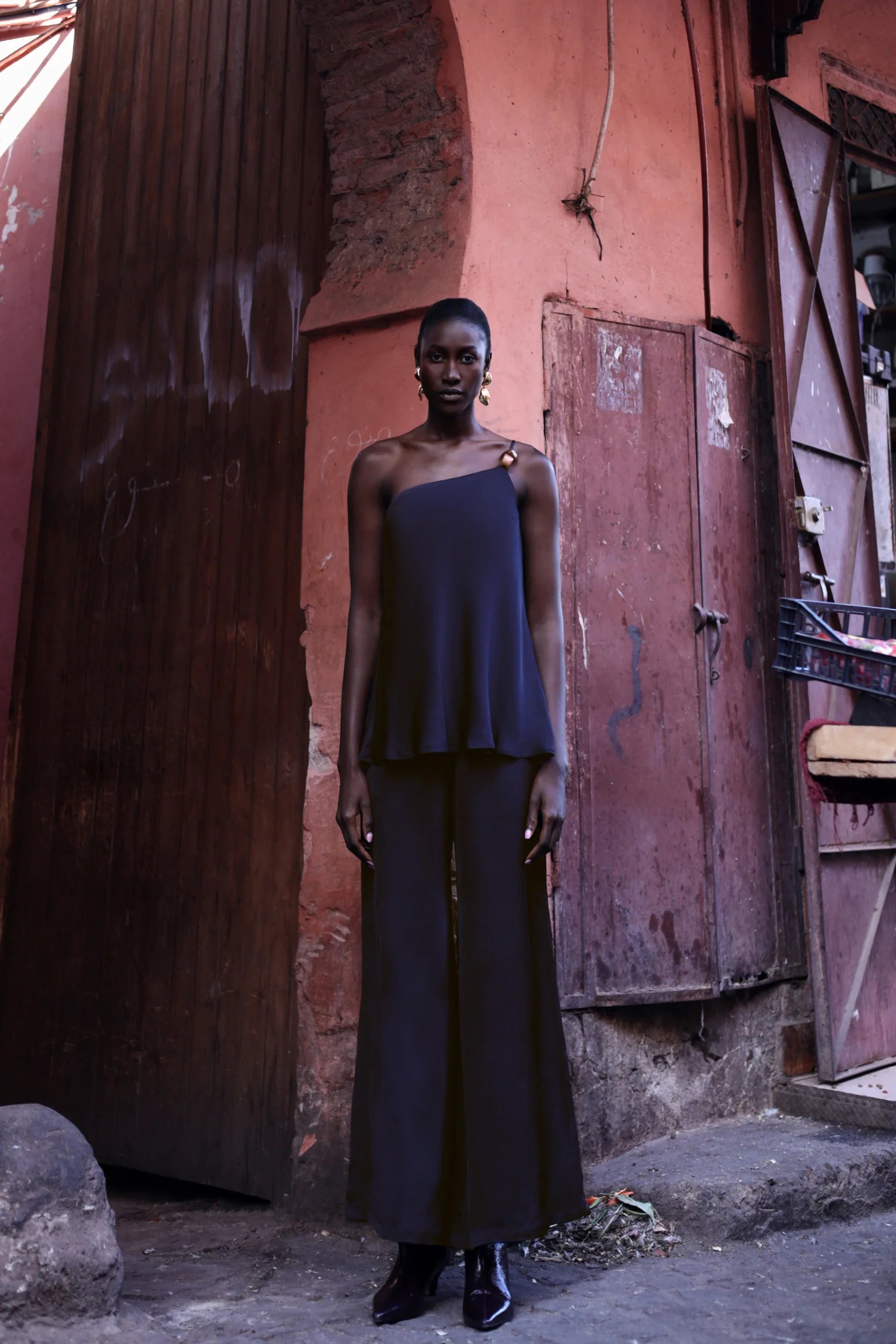 Introducing the "Ferrat Top" in Night Blue – a one-shoulder silhouette in textured fabric with embellished accents. Designed with an adjustable strap and darts at the bodice for structure. Fully lined for coverage. Pair it with the matching bottom for a coordinated look.