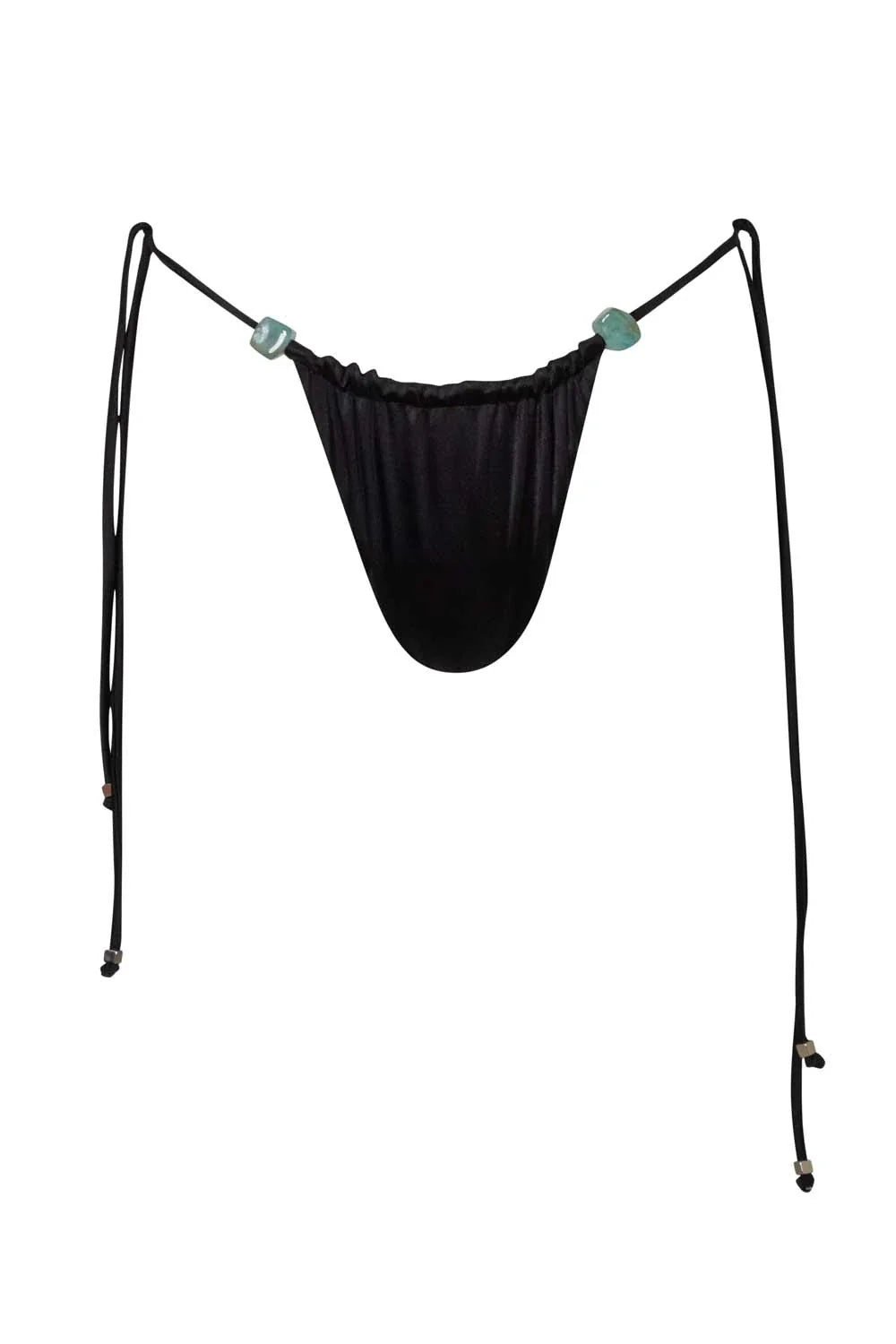 Introducing the "Kaia Bikini Bottom" in Black – a high-cut bikini bottom with self-tie straps and adjustable coverage. Featuring ruched detailing and embellishments, it is fully lined for comfort. Pair with the matching Kaia Bikini Top for a complete look.